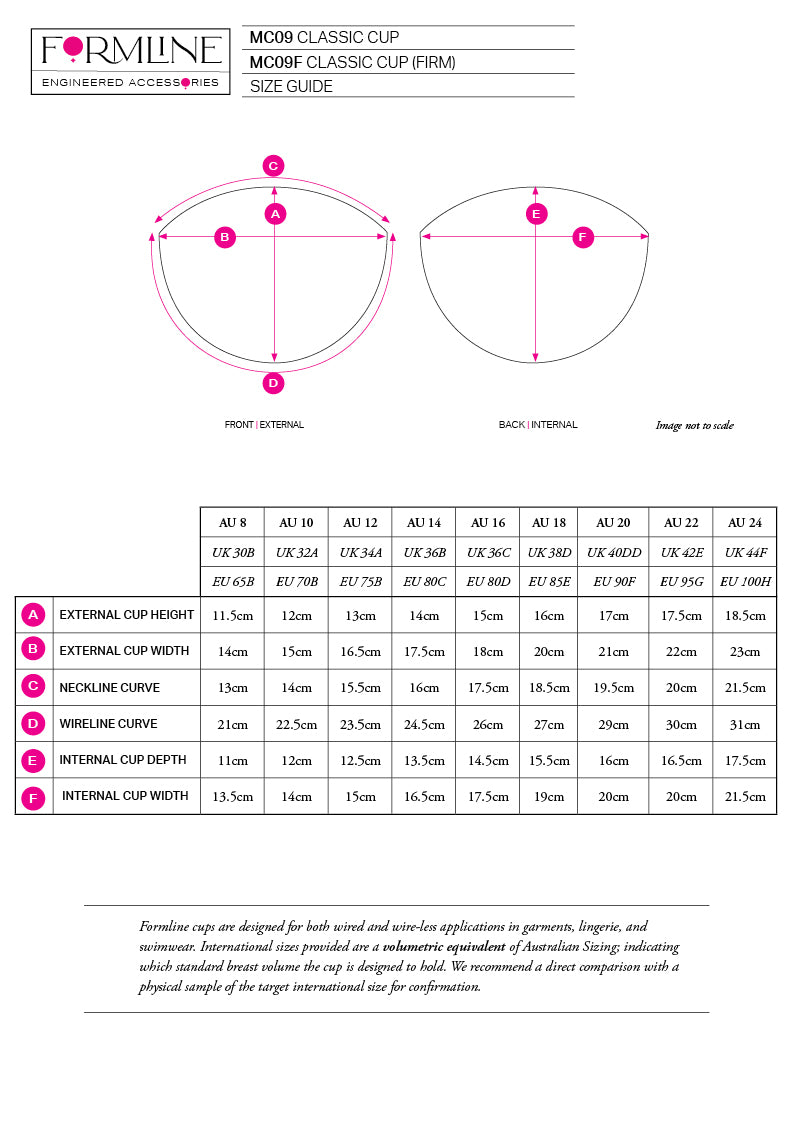 All cup measurements in mm and dimensions are approximate. We recommend purchasing a sample pair to ensure that fit is correct for your garment.